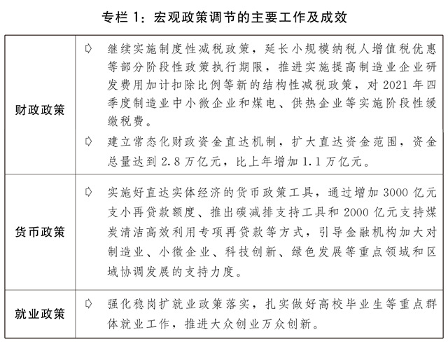 二是保持宏觀政策連續(xù)性針對性。宏觀政策適應跨周期調(diào)節(jié)需要,保持對經(jīng)濟恢復必要支持力度,同時考慮為今年應對困難挑戰(zhàn)預留政策空間。積極的財政政策提質(zhì)增效、更可持續(xù)。保持必要的財政支出規(guī)模,地方政府專項債券發(fā)行使用管理進一步優(yōu)化,建立常態(tài)化財政資金直達機制,將2.8萬億元中央財政資金納入直達范圍,及時為基層保基本民生、保工資、保運轉(zhuǎn)提供財力支持。全年新增減稅降費為市場主體減負超過1萬億元。對制造業(yè)中小微企業(yè)、煤電和供熱企業(yè)實施階段性緩繳稅費。貨幣政策靈活精準、合理適度,靈活運用降準、再貸款、再貼現(xiàn)等多種政策工具,兩次全面降準,流動性保持合理充裕,廣義貨幣供應量(M2)余額和社會融資規(guī)模存量分別增長9%和10.3%。加大對實體經(jīng)濟、重點領域和薄弱環(huán)節(jié)的支持力度,企業(yè)綜合融資成本穩(wěn)中有降,全年新增人民幣貸款19.95萬億元,比上年多增3150億元,大型商業(yè)銀行普惠小微企業(yè)貸款增幅超過40%,企業(yè)貸款平均利率為4.61%,比上年下降0.1個百分點。強化穩(wěn)崗擴就業(yè)政策落實,扎實做好高校畢業(yè)生等重點群體就業(yè)工作,推進大眾創(chuàng)業(yè)萬眾創(chuàng)新。