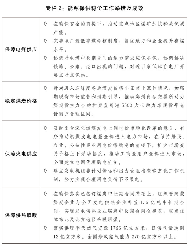 二是積極穩(wěn)妥推進碳達峰碳中和。完善碳達峰碳中和“1+N”政策體系,實施“碳達峰十大行動”,堅持“全國一盤棋”。大力發(fā)展非化石能源,建設大型風電、光伏基地項目,積極發(fā)展分布式新能源,積極推動海上風電集群化開發(fā),穩(wěn)妥推進西南等地大型水電基地建設,大力發(fā)展抽水蓄能,在確保絕對安全的前提下積極有序發(fā)展核電,推進煤炭清潔高效利用。提升電網(wǎng)對可再生能源發(fā)電的消納能力。做好全國碳排放權(quán)交易市場第二個履約周期管理。實施節(jié)能降碳改造升級。積極研究開發(fā)碳捕捉利用與封存技術。優(yōu)化完善能耗雙控政策,合理增加能耗總量彈性,新增可再生能源和原料用能不納入能源消費總量控制,推動能耗“雙控”向碳排放總量和強度“雙控”轉(zhuǎn)變。全面加強能源資源節(jié)約,強化工業(yè)、交通和建筑節(jié)能,不斷降低單位產(chǎn)出能耗物耗和碳排放。對標能效標桿水平,推動能效低于基準水平的重點行業(yè)企業(yè),有序?qū)嵤└脑焐墸龠M高耗能行業(yè)高質(zhì)量發(fā)展。繼續(xù)做好碳達峰碳中和及應對氣候變化國際談判與合作,主動參與全球綠色治理體系建設,加強綠色經(jīng)貿(mào)、技術與金融合作。