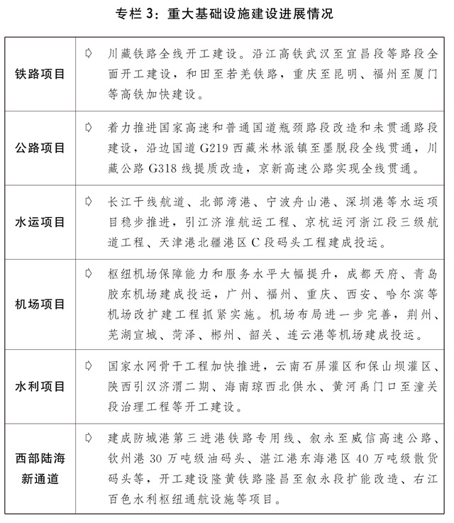 四是適度超前開展重大基礎設施建設。精準有效推進交通、水利、物流、能源、新型基礎設施、民生等領域重大基礎設施項目建設。推進川藏鐵路、西部陸海新通道、沿江高鐵、一批鐵路專用線重點項目和川藏公路G318線提質(zhì)改造等加快建設。整體推進京津冀、長三角、粵港澳大灣區(qū)城市群城際鐵路、市域(郊)鐵路建設。鼓勵推廣軌道交通+土地綜合開發(fā)模式經(jīng)驗。做好中長期鐵路網(wǎng)、國家公路網(wǎng)和全國港口與航道布局規(guī)劃修編,強化國家公路、港口和高等級航道網(wǎng)絡功能。推動三峽水運新通道研究論證。實施國家水網(wǎng)重大工程。加快發(fā)展公鐵水多式聯(lián)運。提升樞紐機場綜合保障能力和服務水平,加快培育支線航空市場,提高國際航空貨運能力。加快“支點城市+骨干走廊”現(xiàn)代流通網(wǎng)絡建設。穩(wěn)步推進國家物流樞紐、國家骨干冷鏈物流基地建設,強化冷鏈運輸環(huán)節(jié)疫情防控措施,完善“321”冷鏈物流運行體系。加快物流業(yè)制造業(yè)融合創(chuàng)新發(fā)展,積極推動多式聯(lián)運、智慧物流等新業(yè)態(tài)新模式發(fā)展。布局一批新型基礎設施項目,加快推進5G、千兆光網(wǎng)、一體化大數(shù)據(jù)中心、北斗產(chǎn)業(yè)化重大工程、民用空間基礎設施等建設,推動傳統(tǒng)基礎設施智能化改造。