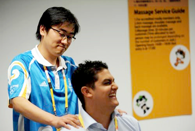 在人數(shù)眾多的志愿者當(dāng)中有一群十分特殊的身影——“中醫(yī)按摩保健服務(wù)志愿者”,這是北京奧運(yùn)中醫(yī)藥服務(wù)工作的一部分,也是中醫(yī)藥第一次登上奧運(yùn)會(huì)的舞臺(tái)。