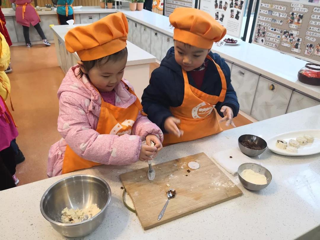 ▲金蘋果新蒙特梭利幼稚園(南苑園)的孩子們正在制作糕點。