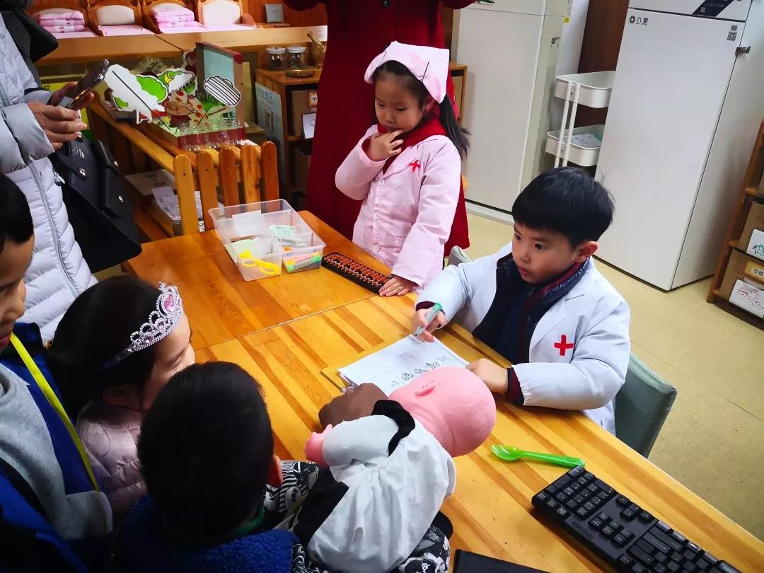 ▲金蘋果新蒙特梭利幼稚園(南苑園)的孩子們正在扮演小中醫脈診。