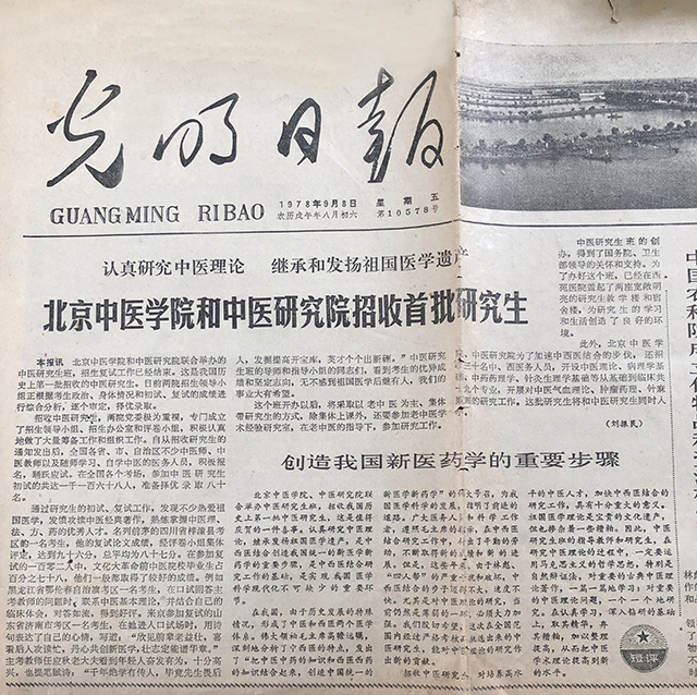 1978年9月8日,《光明日報》頭版對此事進行了報道,并配發了短評(照片二)。文中強調這是我國歷史上第一批中醫研究生,是創造我國新醫藥學的重要步驟。大約在9月中旬,我收到了錄取通知書,有幸成為我國歷史上第一批中醫研究生中的一員。