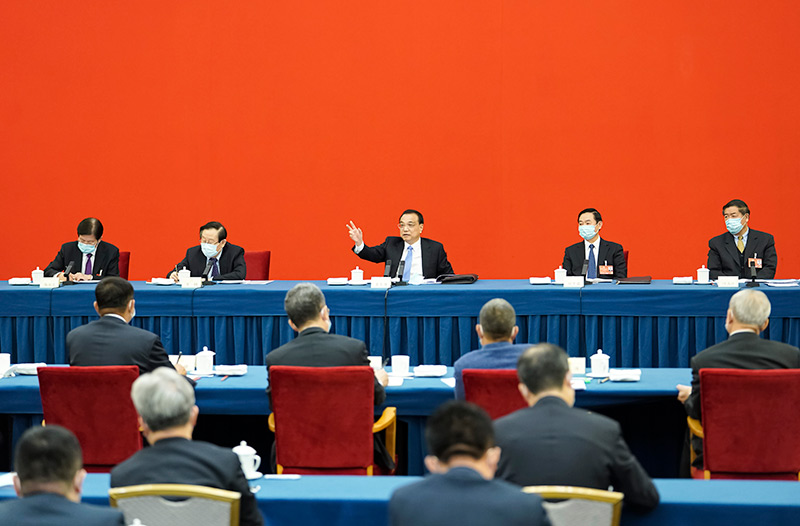 3月6日,中共中央政治局常委、國務院總理李克強看望出席全國政協十三屆五次會議的經濟界委員并參加討論。新華社記者 殷博古 攝