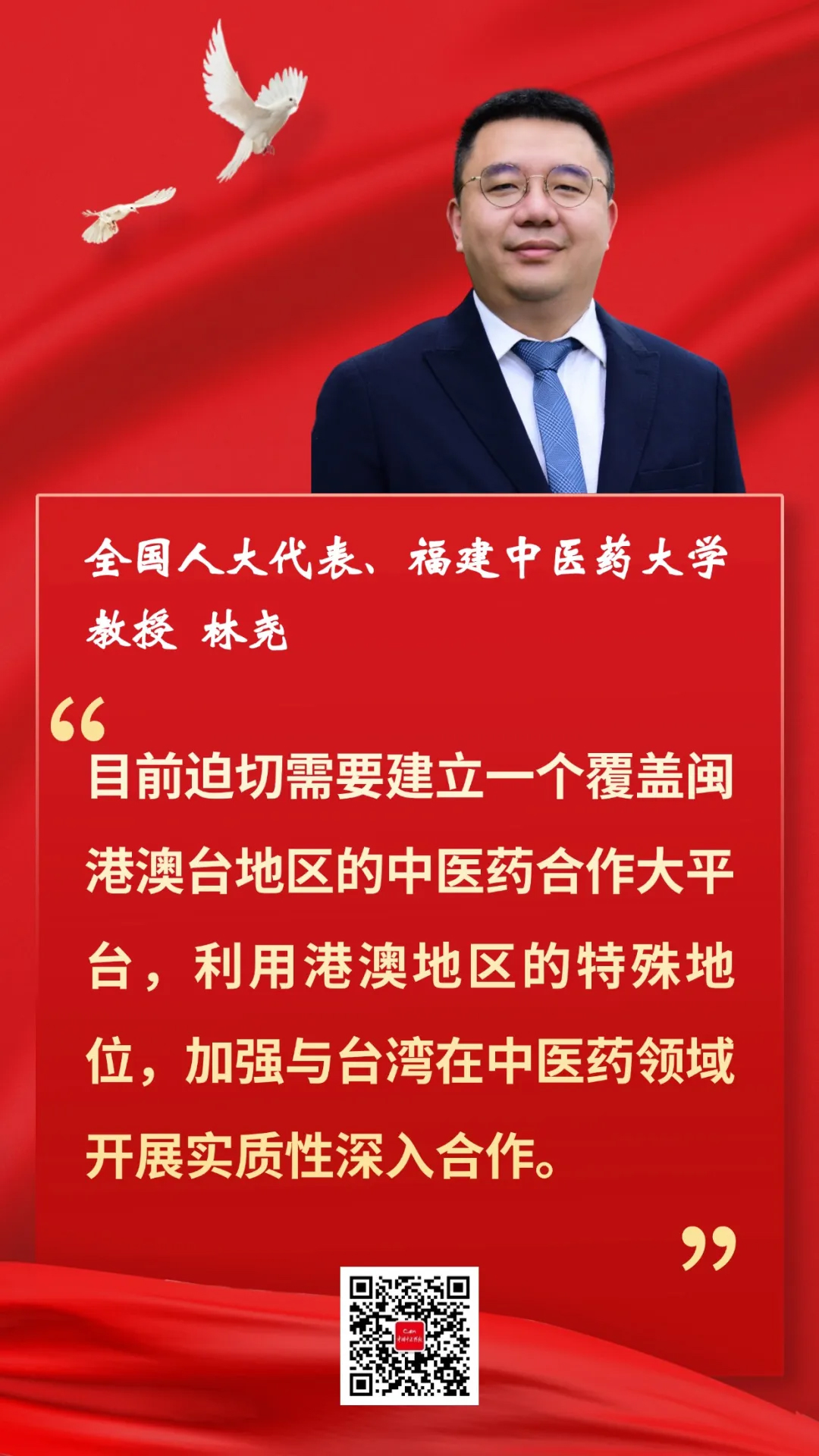 在文化傳承與推廣方面,他還建議,要針對閩港澳臺地區共同的中醫藥歷史傳承和中草藥資源,設立閩港澳臺地區中醫藥宣傳專項資金,支持閩港澳臺中醫藥文化的交流與合作活動,重點宣傳閩港澳臺地區同根同源的中醫藥文化,打造中醫藥文化名片,促進閩港澳臺地區中醫藥融合發展。