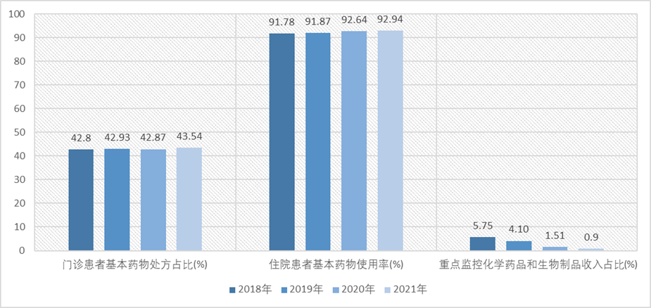 (三)醫療質量和安全水平穩步提升。一是重點環節質量持續改善。2021年,全國三級公立中醫醫院手術患者并發癥發生率較2020年下降0.02個百分點,I類切口手術部位感染率與2020年基本持平。二是大型醫用設備使用與管理愈加規范。2021年,全國三級公立中醫醫院大型醫用設備檢查陽性率為87.87%,較2020年提升2.58個百分點。建立大型醫用設備管理臺賬、制定預防性維護維修計劃的中醫醫院比例有所增加,多數醫院能夠定期對設備設施進行巡查保養和檢測校準,并定期開展大型醫用設備檢查適宜性評價,大型醫用設備管理的規范化水平逐步提高。三是合理用藥水平持續提升。部分中醫醫院建立了“多部門聯席會議機制”,對抗菌藥物和輔助用藥進行統一監測,對臨床用藥情況進行全面分析,通過信息化技術對國家基本藥物和國家組織藥品集中帶量采購中標藥品通用名進行標記,引導臨床醫生優先選用。2021年,全國三級公立中醫醫院抗菌藥物使用強度為33.17DDDs,較2020年下降0.11DDDs,持續優于40DDDs的國家要求。基本藥物采購品種數占比為44.46%,較2020年增加0.49個百分點;門診和住院患者基本藥物處方占比分別為43.54%和92.94%,較2020年增加0.67和0.3個百分點,基本藥物主導地位進一步強化。重點監控化學藥品和生物制品(依據第一批國家重點監控合理用藥藥品目錄)收入占比為0.9%,較2020年下降0.61個百分點;點評處方占處方總數的比例為9.79%,較2020年增加0.24個百分點;點評中藥處方占中藥處方總數的比例為8.46%,較2020年下降0.22個百分點,穩定在合理水平,臨床合理用藥點評管理工作得到進一步落實(見圖4)。