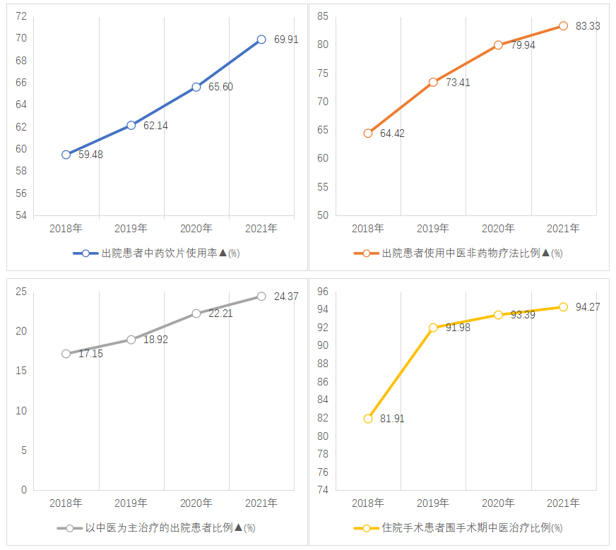 (一)中醫藥特色優勢持續發揮。一是中醫藥特色相關指標均呈現逐年上升趨勢。2021年,在門診醫療服務方面,門診中藥處方比例為62.25%、門診散裝中藥飲片和小包裝中藥飲片處方比例為25.09%、門診患者中藥飲片使用率為35.25%、門診患者使用中醫非藥物療法比例為16.9%,較2020年均有明顯提升,其中門診患者中藥飲片使用率,較2020年上升1.91個百分點,提升幅度最大。在住院醫療服務方面,出院患者中藥飲片使用率為69.91%,較2020年提升4.31個百分點;出院患者使用中醫非藥物療法比例83.33%,較2020年增加3.39個百分點;以中醫為主治療的出院患者比例為24.37%,較2020年上升2.16個百分點;住院手術患者圍手術期中醫治療比例為94.27%,較2020年上升0.88個百分點(見圖1和圖2);其中山西、新疆、青海等省份在住院醫療服務方面中醫特色較為明顯。二是三級公立中醫醫院更加注重從整體觀出發,在中醫藥理論指導下,合理地選擇多樣化的中醫治療技術、手段和方法,最大限度發揮中醫整體治療優勢。