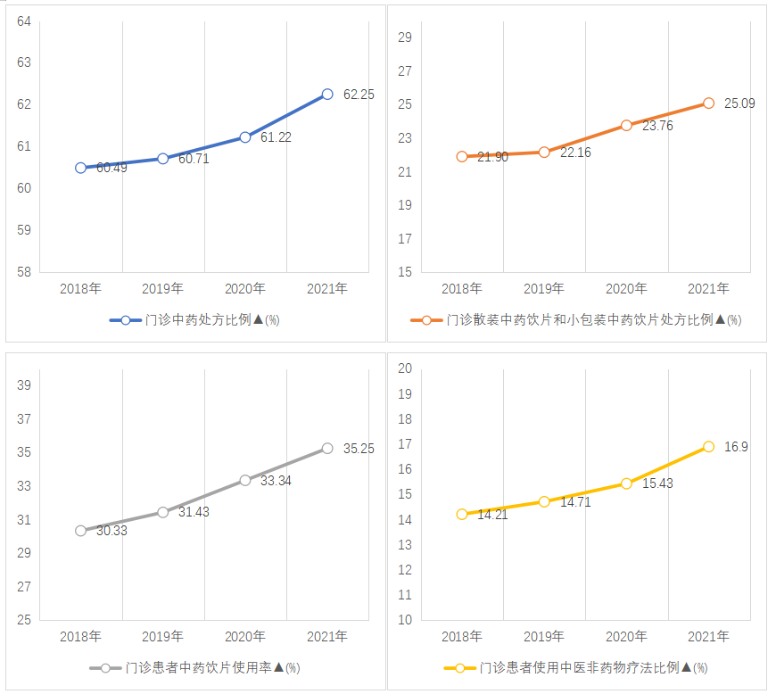 圖1 2018-2021年 三級公立中醫醫院門診特色指標變化情況
