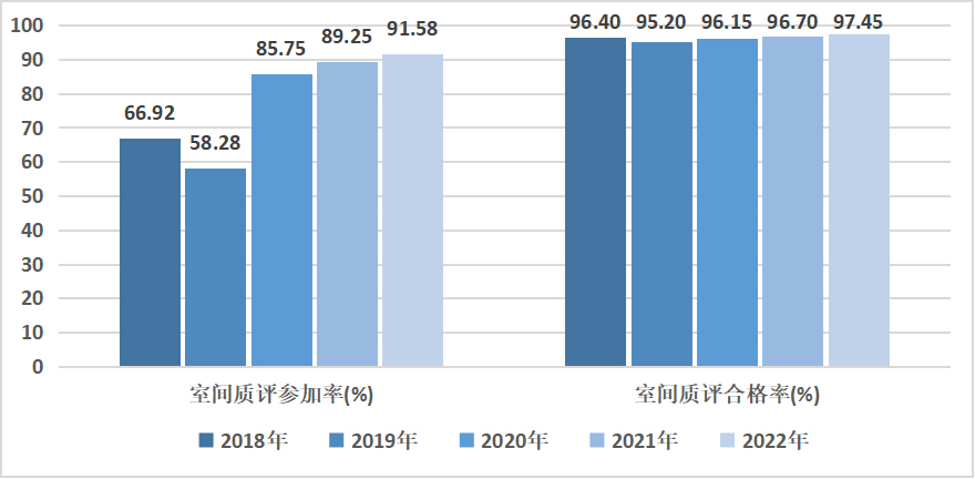 圖6 2018-2022年三級(jí)公立中醫(yī)醫(yī)院室間質(zhì)量評(píng)價(jià)項(xiàng)目參加率和合格率情況