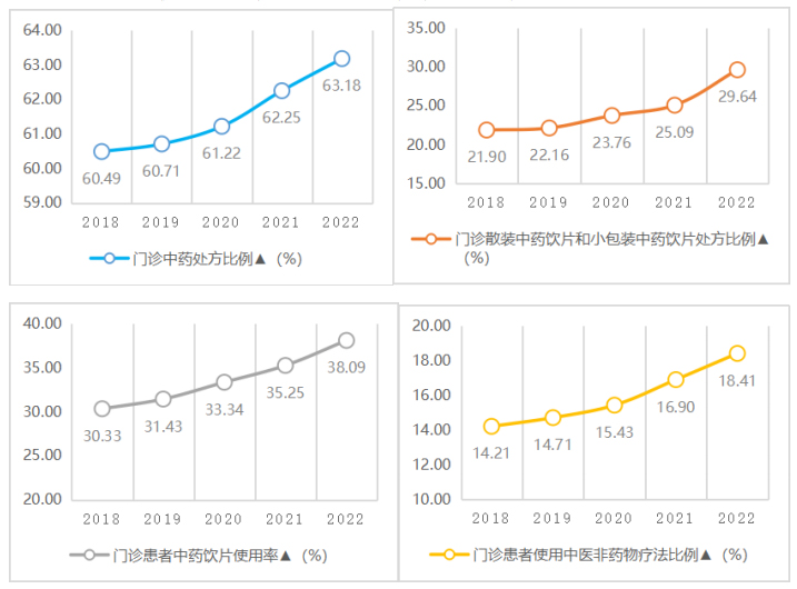 圖2 2018-2022年 三級(jí)公立中醫(yī)醫(yī)院門診特色指標(biāo)變化情況